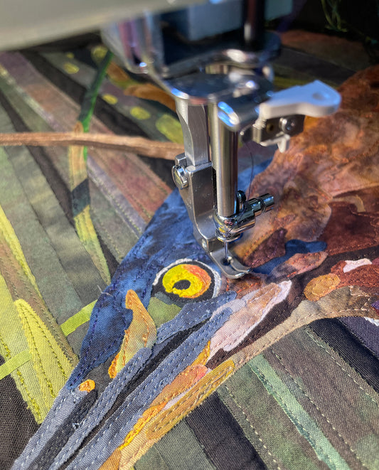 Each fabric collage begins with a story—sometimes drawn from memory, sometimes inspired by the natural world just outside my studio window. I work with hand-dyed fabrics, reclaimed materials, and thoughtful stitching to build layered, textured images that invite a closer look. Many of these pieces reflect personal experiences: berry picking with my family, wildlife sightings on Park Point, or quiet moments in the woods and along the shore.