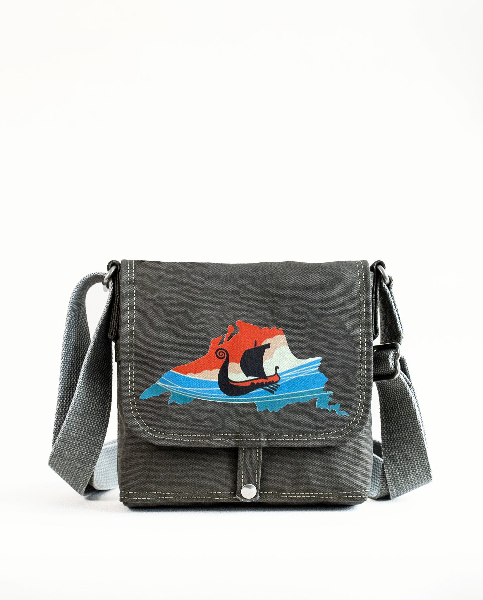 Handcrafted canvas messenger bag with a Lake Superior Viking Ship design